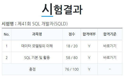 1๊ณผ๋ชฉ ๋ฐ์ดํฐ ๋ชจ๋ธ๋ง์ ์ดํด, 2๊ณผ๋ชฉ SQL ๊ธฐ๋ณธ ๋ฐ ํ์ฉ ๊ฐ๊ฐ 40์ ์ด์, ํฉ์ณ์ ํ๊ท 60์ ์ด์์ ๋ฐ์์ผ ํฉ๊ฒฉ์ด๋ค.