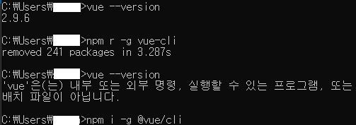 - 2.x ๋ฒ์ ์ญ์ ํ 3.x ๋ฒ์ ์ค์นํ๋ ๊ฒฝ์ฐ : npm r -g vue-cli ์ ๋ ฅ ํ, npm i npm i -g @vue/cli ์ ๋ ฅ